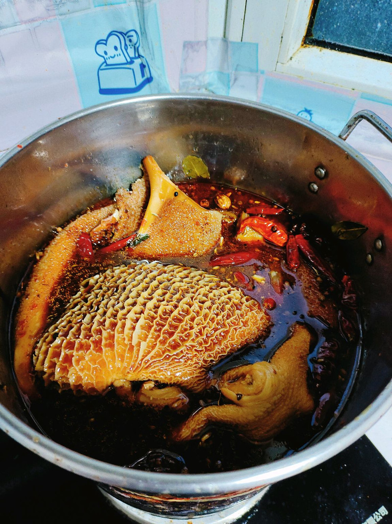 老公今天买了一整幅的牛肚回来,另外还有两个毛肚,我把它全部卤了,放在冰箱冷冻保存,想吃的时候直接取出来解冻,再加酸辣椒炒着吃,味道好极了!虽然忙活了一晚上,但看到家人都爱吃,满足的笑容,累并快乐着!