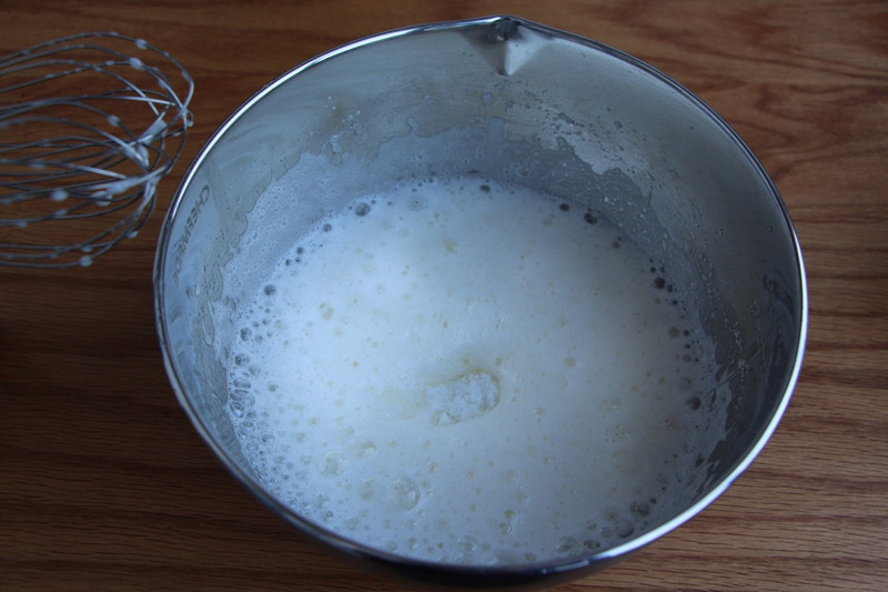 2蛋白霜在打发时要打至湿性发泡,提起打蛋器留下一个大弯钩即可,(不要打硬了,成为直立的尖角烤好的蛋糕卷会卷不起来的,嗯卷一下会裂开)