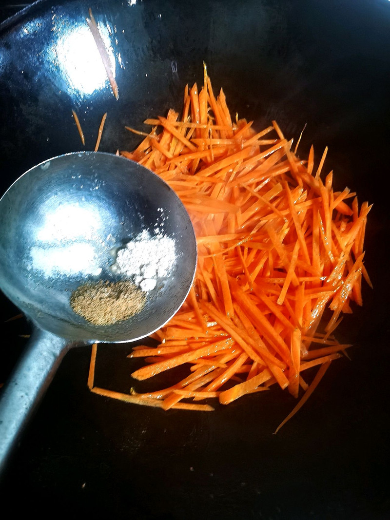 然后就是烹调方法了,褐色的是牛肉粉,白色鸡粉,少量味精,少量香油(有味就够),胡萝卜直接炒即可,断生就可,这里呢,建议进入咸淡就行。 其他食材方法一样,唯一不同的是,黄豆芽,牛肉,香菇,需过水烫熟,调料翻炒均匀出锅。圆葱要炒的久一点,易辣。角瓜断生就可,不要过久,也不要太短,久了没有口感,短了,不熟。石锅拌饭的烹饪技巧
