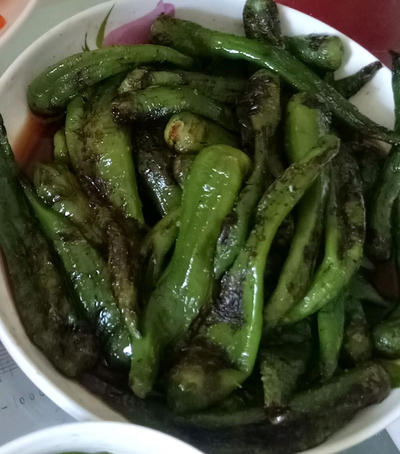 买辣椒的时候越老越辣,煎的时间可以久一点,让辣椒完全煎熟变软,煎好以后多放一些醋,可以降低辣度。