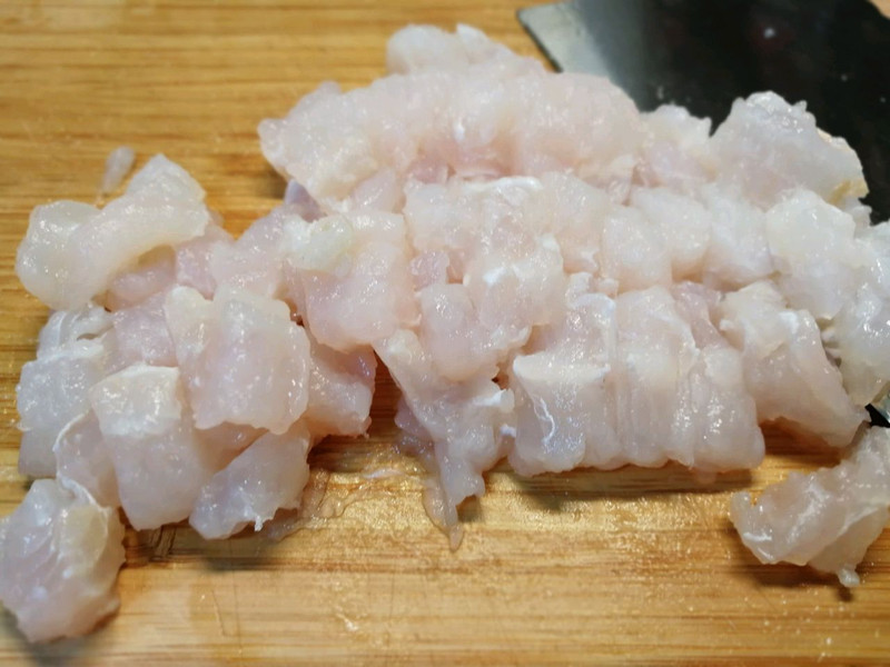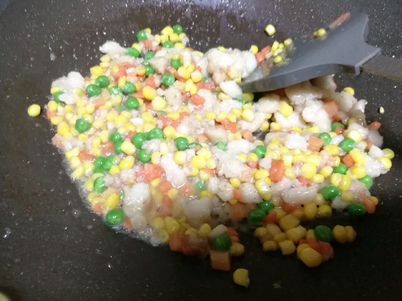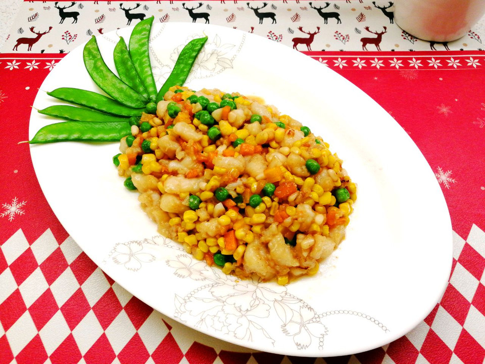 食材:青豆玉米粒,胡萝卜,蒜瓣3瓣,松子仁一把,龙利鱼250克(或河虾仁)