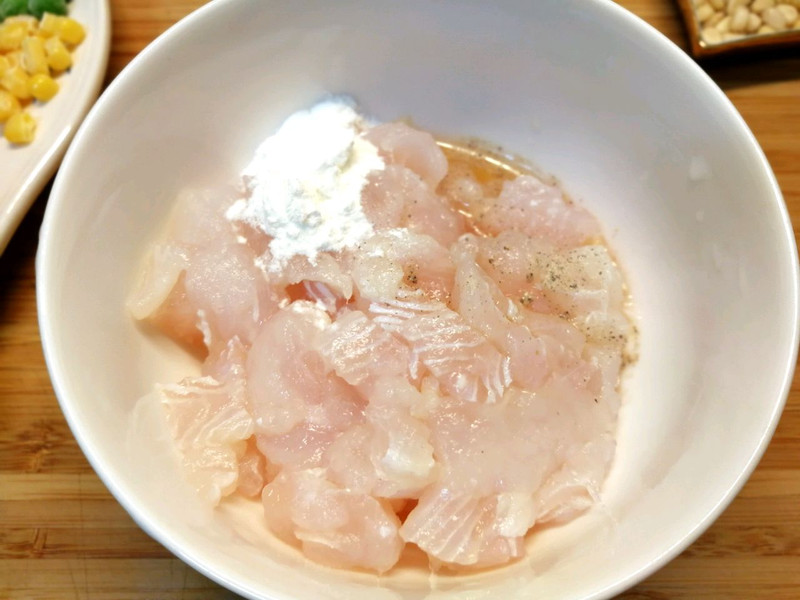 制作:玉米粒和青豆冲洗一下,胡萝卜切小粒。龙利鱼洗净滤干用厨房纸吸干水分,切丁用料酒和胡椒粉淀粉和少许盐搅拌均匀,蒜瓣切末,锅内放油烧热放入蒜瓣炒香倒入龙利鱼翻炒加六月鲜轻盐牡蛎酱油搅拌均匀,倒入青豆玉米胡萝卜继续翻炒至熟,加少许鸡精倒入松子拌匀即可。全程不需要加水。