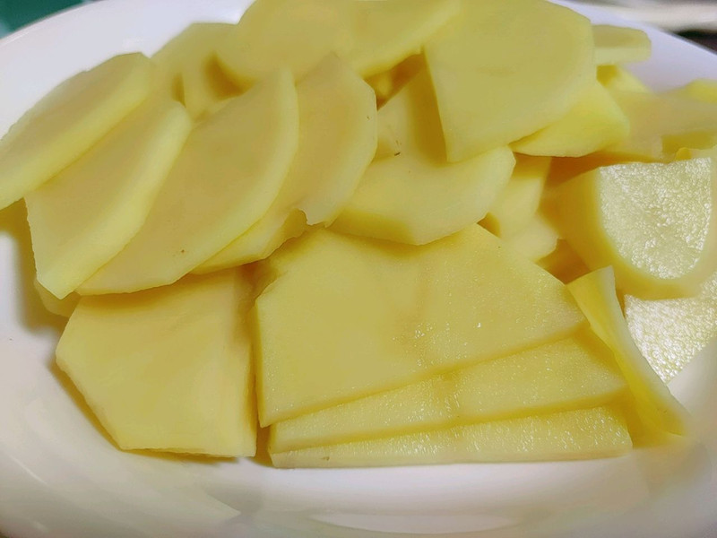 2,土豆片切厚一点,炸好后外脆里软,如果太薄就没有这个口感了。