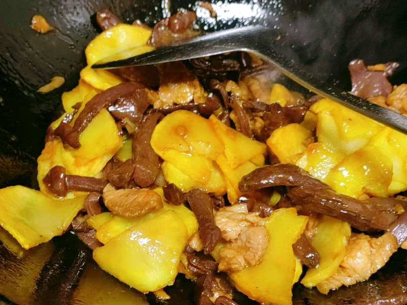 红蘑是东北特产,长在松树下,肥厚鲜美,东北人家里都会长年存一些晒干的红蘑,吃的时候只要泡发就鲜美如初了。这道红蘑土豆片咸鲜下饭,是东北人的家常菜。