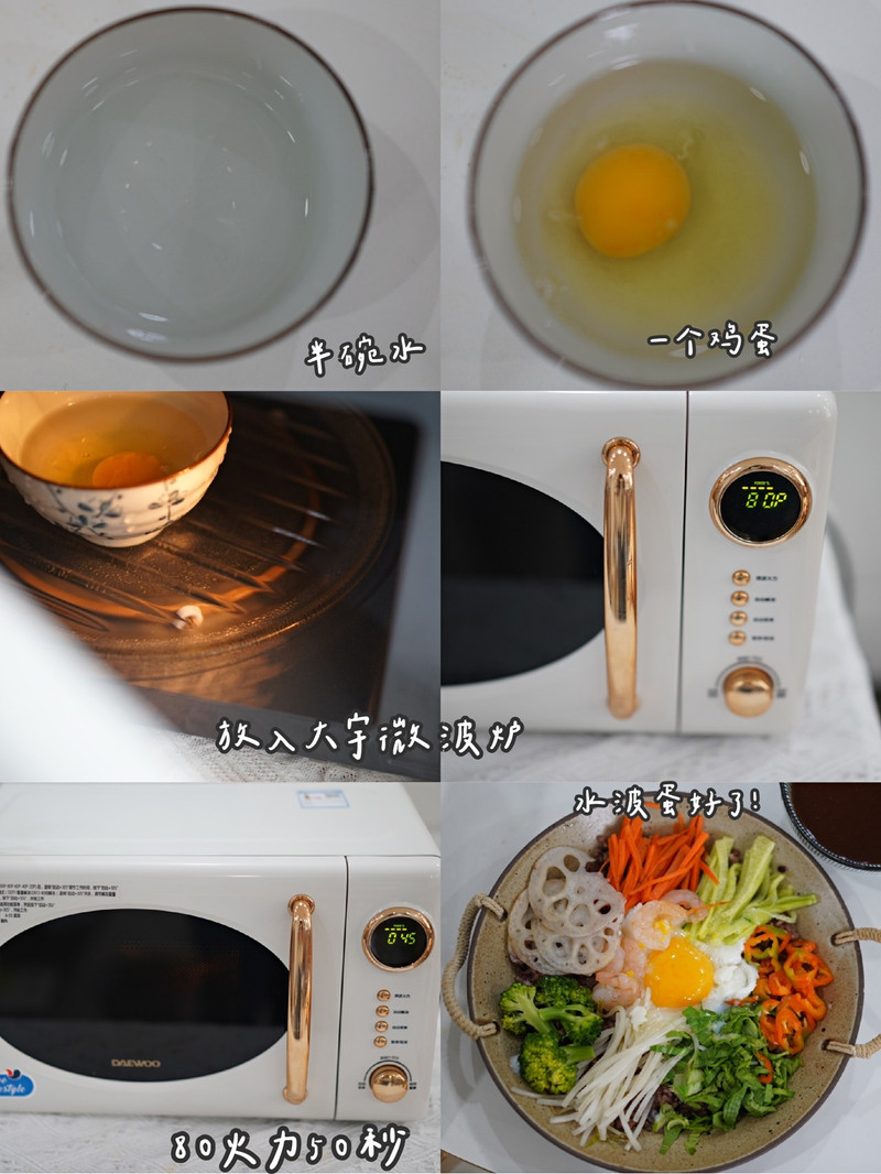 4️⃣做个水波蛋,半碗水,打入一个鸡蛋,微波炉叮50秒,水波蛋就好啦!