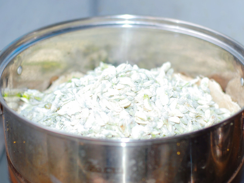 4、蒸槐花的时间要根据槐花的量来调整,如果槐花多就多蒸一会儿,如果槐花少的话就可以少蒸一会儿。