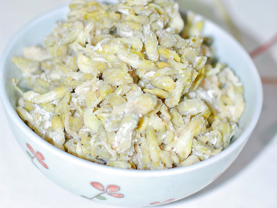 3、拌面粉的时候注意量千万不要多了,让槐花表面均匀裹上薄薄的一层面粉就可以了。