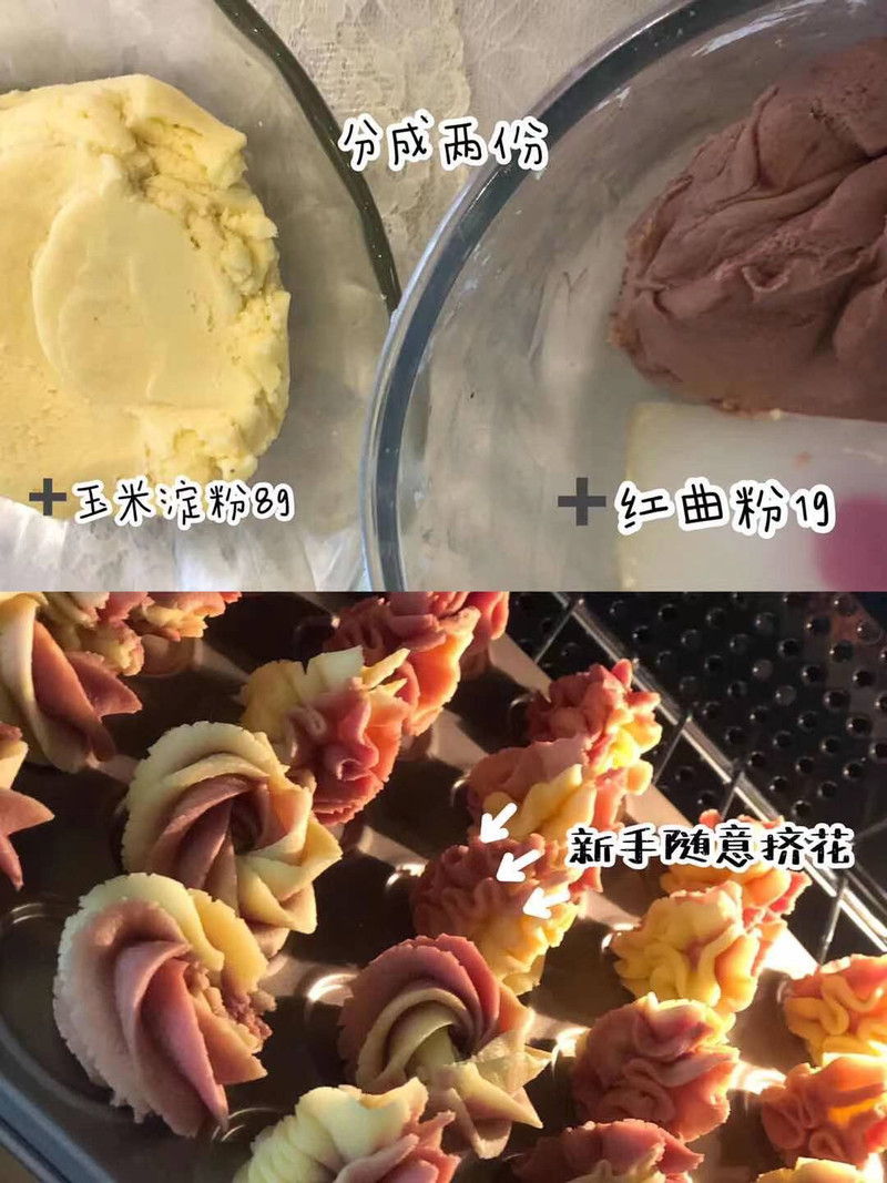 做法: 1⃣️黄油分为两份(85g为一份) 一半软化一半液化 2⃣️软化的黄油放入厨师机中加入糖粉高速打发至发白后取出到碗中 3⃣️过筛加入低筋面粉和玉米淀粉(115g),再把液化的黄油加进入 4⃣️用刮刀翻拌成面团 5⃣️平均分成两个面团,一份加8g玉米淀粉,一份加入1g红曲粉(想要颜色重可以加2g) 6⃣️翻拌均匀后两团面糊一起放入裱花袋中 7⃣️随意挤花在烤盘上 8⃣️烤箱150度烘烤30min即可