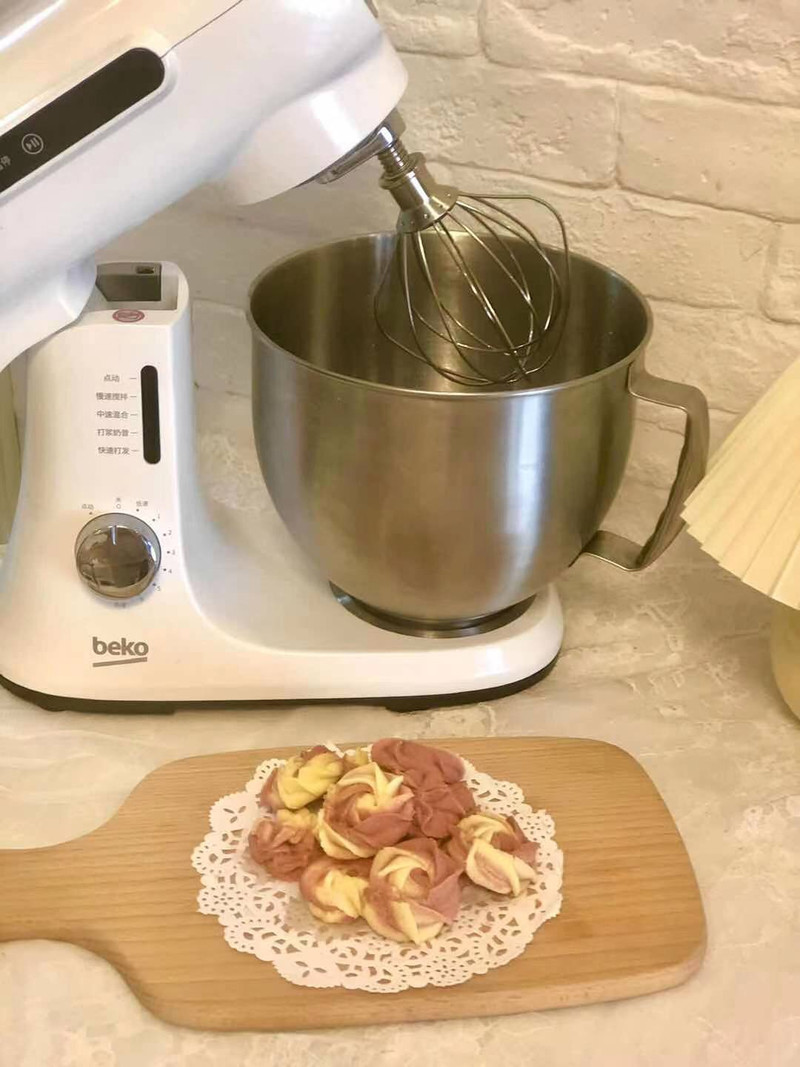 做法: 1⃣️黄油分为两份(85g为一份) 一半软化一半液化 2⃣️软化的黄油放入厨师机中加入糖粉高速打发至发白后取出到碗中 3⃣️过筛加入低筋面粉和玉米淀粉(115g),再把液化的黄油加进入 4⃣️用刮刀翻拌成面团 5⃣️平均分成两个面团,一份加8g玉米淀粉,一份加入1g红曲粉(想要颜色重可以加2g) 6⃣️翻拌均匀后两团面糊一起放入裱花袋中 7⃣️随意挤花在烤盘上 8⃣️烤箱150度烘烤30min即可玫瑰曲奇的烹饪技巧