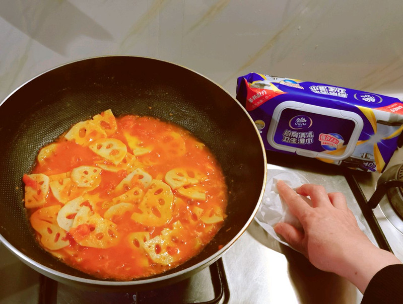 清新爽口的茄汁莲藕片,酸酸甜甜的口味,脆嫩的口感,真是好喜欢,但是飞溅的番茄汁似乎有些不够友好,由于没有及时处理,多次将我的白色橡胶垫染色,于是我选用维达厨房湿巾,抽取方便干净卫生,边料理边清洁,让厨余污渍不再停留,厨房卫生清扫快速及时,灶台、操作台干净了,做饭的人自然心情大好,感谢维达好产品。