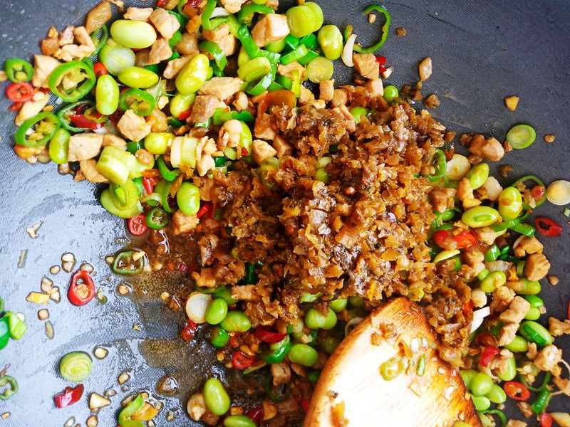 毛豆要提前煮熟,这样炒制时不用特意加水焖煮,炒出的外婆菜更香。