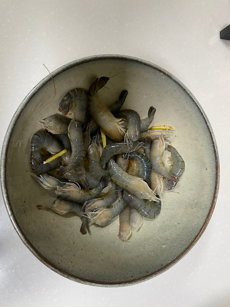 不要怕糊,只要不停翻炒,中火,不会糊的。虾腌制大概20分钟。
