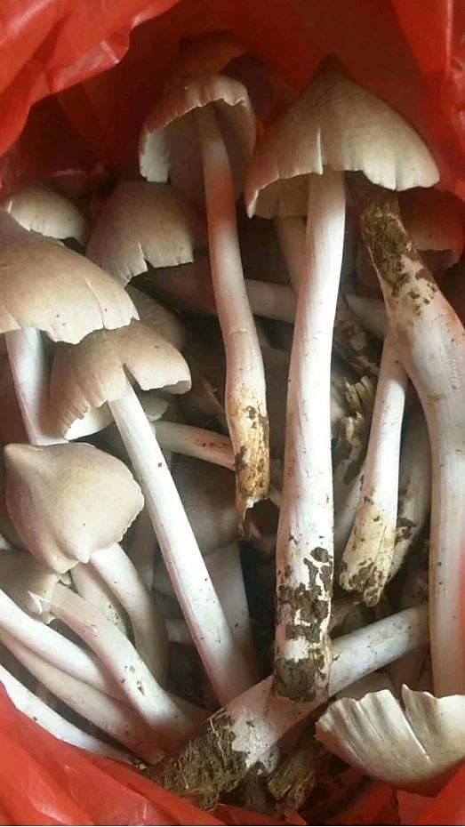 荔枝菌,素有岭南菌王之称,每年农历五月初一开始到夏至时节、荔枝成熟结果之时段,但每年都是昙花一现,时间不长,最多一个月左右。荔枝菌在荔枝林潮湿的白蚁窝上,经过高温多雨、骤出太阳骤降大雨的催谷,迅速生长起来。这趟摘完了,只要不毁坏白蚁窝,没过几天又长了出来。荔枝菌一般在午夜生长,略呈纺纱缍形状,长达10-20厘米,菌尖似一把收紧的小雨伞,味道极之清鲜、爽口。