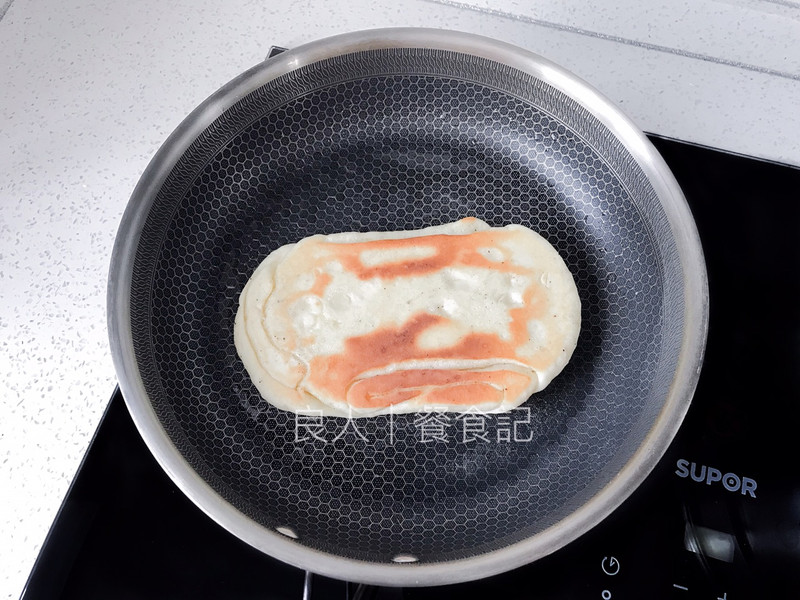 4、烤制是全程小火,放入锅内后,1分钟内不要动面饼,让面饼在锅中借着温度再次发酵变大蓬起变松软,1分钟后再翻面烤制另一面