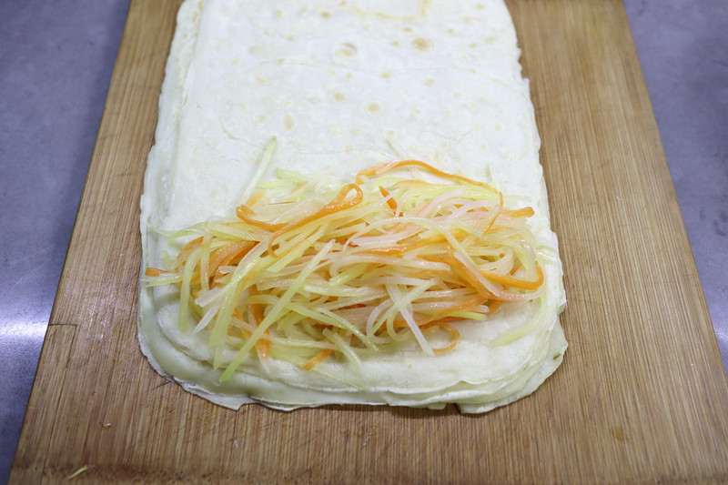 2. 如果是早餐吃,可以烙好两张饼后就开始卷土豆丝,这样比全部烙好再卷还能节省时间;同时煎蛋也可以另起锅,更省时间。