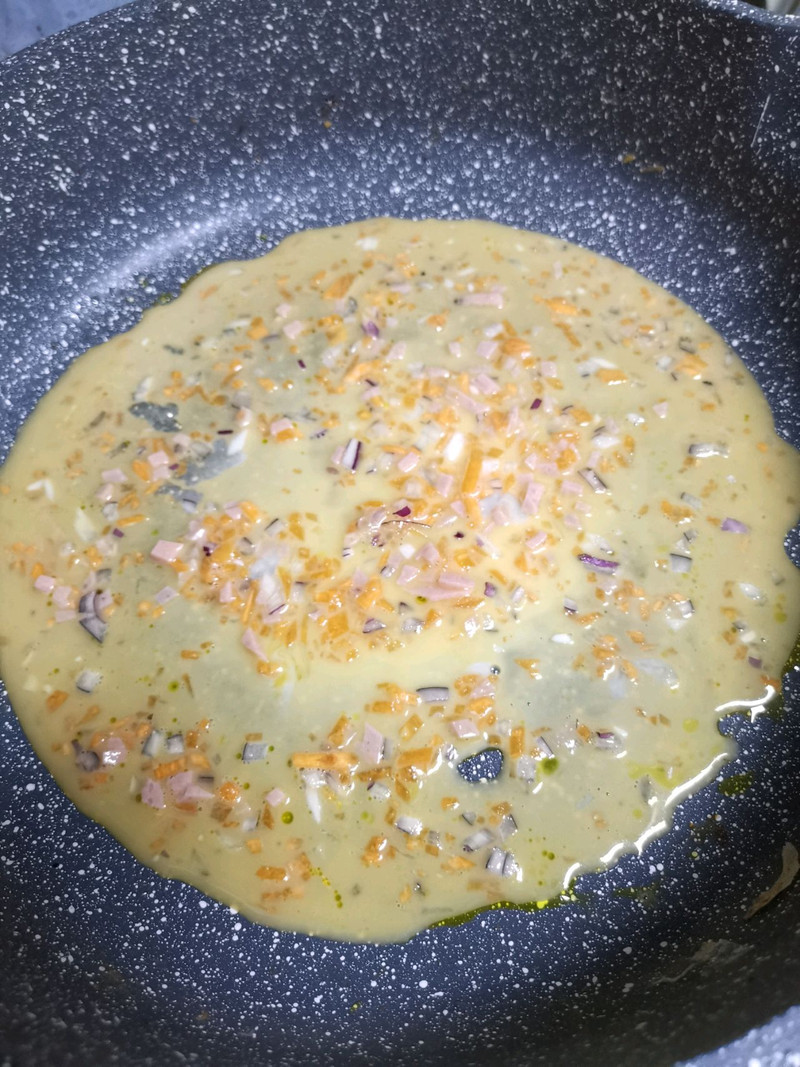 3、煎的时候小火,可以盖锅盖,促进蛋液凝固