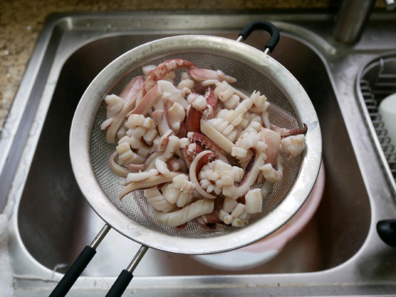 鱿鱼要提前汆熟,这样可以定型,炒起来也不会出水