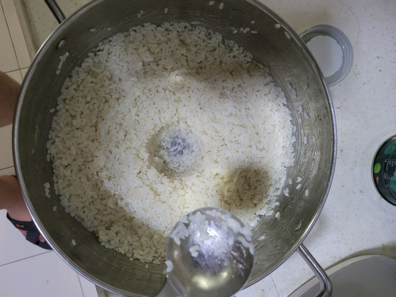 要注意把控温度,糯米蒸好了以后降温冲凉水不能把温度冲凉!,要留一点余温三十多度吧。因为糯米充过凉水以后,本身就有点水分,就不需要额外加水,然后把酒曲倒到糯米里搅拌,搅拌均匀,中间掏个洞。你也别问我为什么掏个洞,长辈就这么干的。