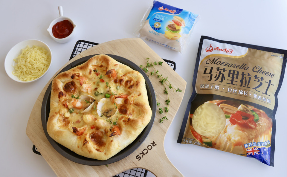 完了 最近披萨吃上瘾了!上次买的安佳马苏里拉芝士不是还没有吃完嘛,今天再来掳个披萨,今天做个豪华版本的至尊海陆披萨,海陆就由大虾、蛤蜊和培根来组成好啦!在周围又用安佳的芝士片做了一个芝心,吃起来简直不要太过瘾了!做披萨的点睛之笔就是这款马苏里拉芝士了,我上次用过后就再也没有更换过了,安佳马苏里拉芝士,也是新西兰原装进口,品质更高。拉丝效果特别好,口感是那种柔软中带点嚼劲,吃起来超有满足感!做芝心用到的安佳芝士片,原制干酪含量高,风味更加丰富,用来制作汉堡、三明治是非常不错的选择~