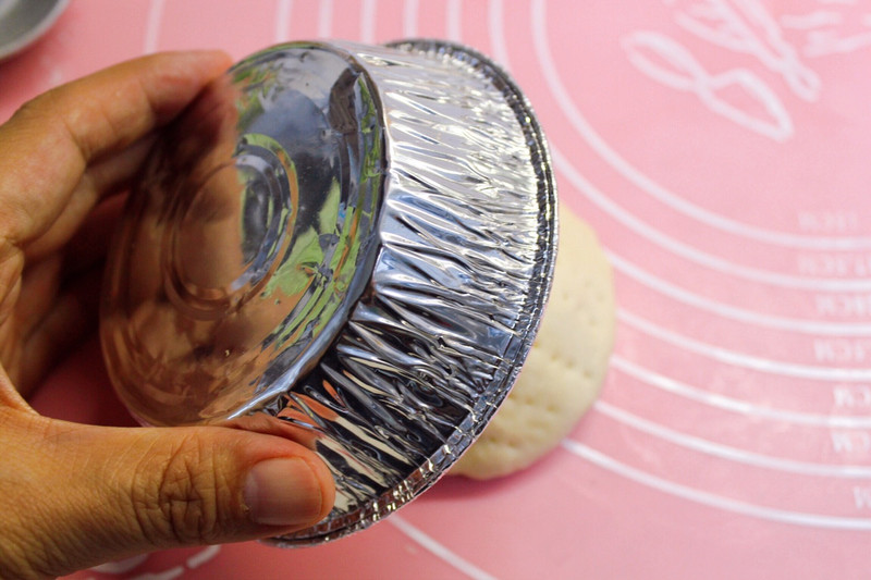 蛋挞模具和烤碗要放正,再加上重物压住,配合好可以做出小碗一般的面包;