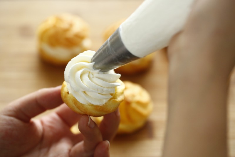 切开的泡芙中间挤上打好的奶油馅做夹心即可食用