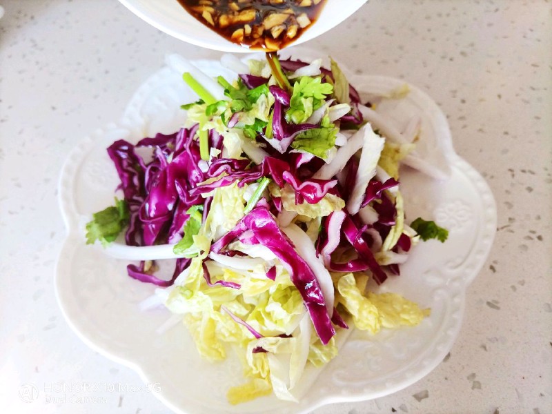 娃娃菜、紫甘蓝和香菜搭配在一起,凉拌着吃,料汁里放上豪吉牌麻辣香汁,没想到这么好吃,节日里吃多了大鱼大肉,清爽解腻的凉拌菜做起来。