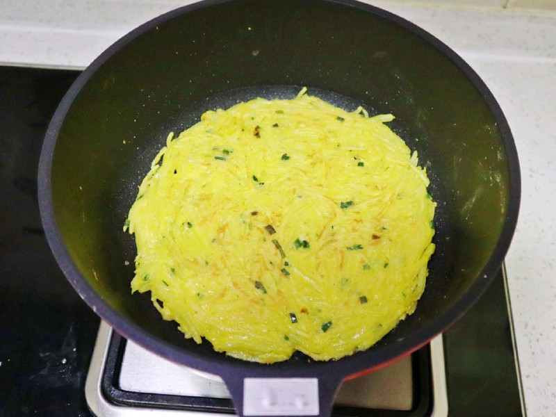 1.土豆丝尽量切细一些,比较容易熟,擦丝后不要淘洗,土豆本身的淀粉更容易帮助土豆饼的成型