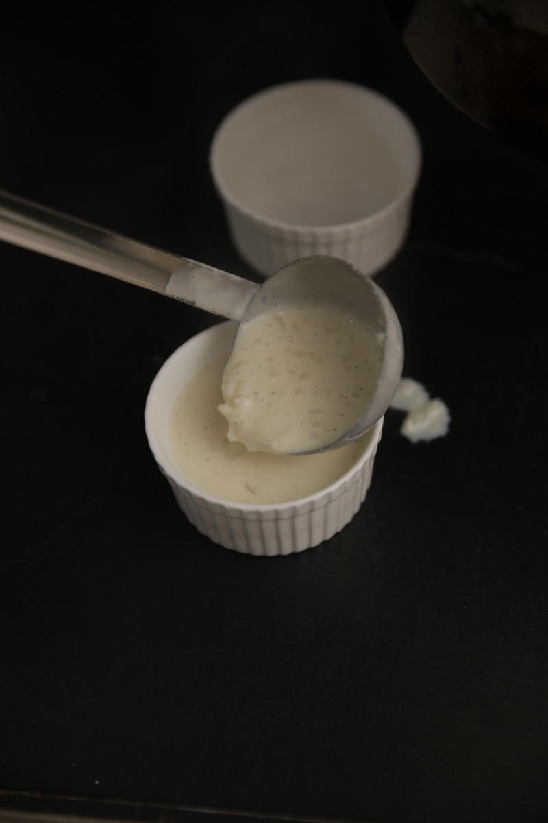 3.烘烤时牛奶糊很容易溢出来,最好选择高一点有底的瓷模具,装至六分满再送烤箱烘烤,或铺上油纸再放上模具,就不容易弄脏烤盘。