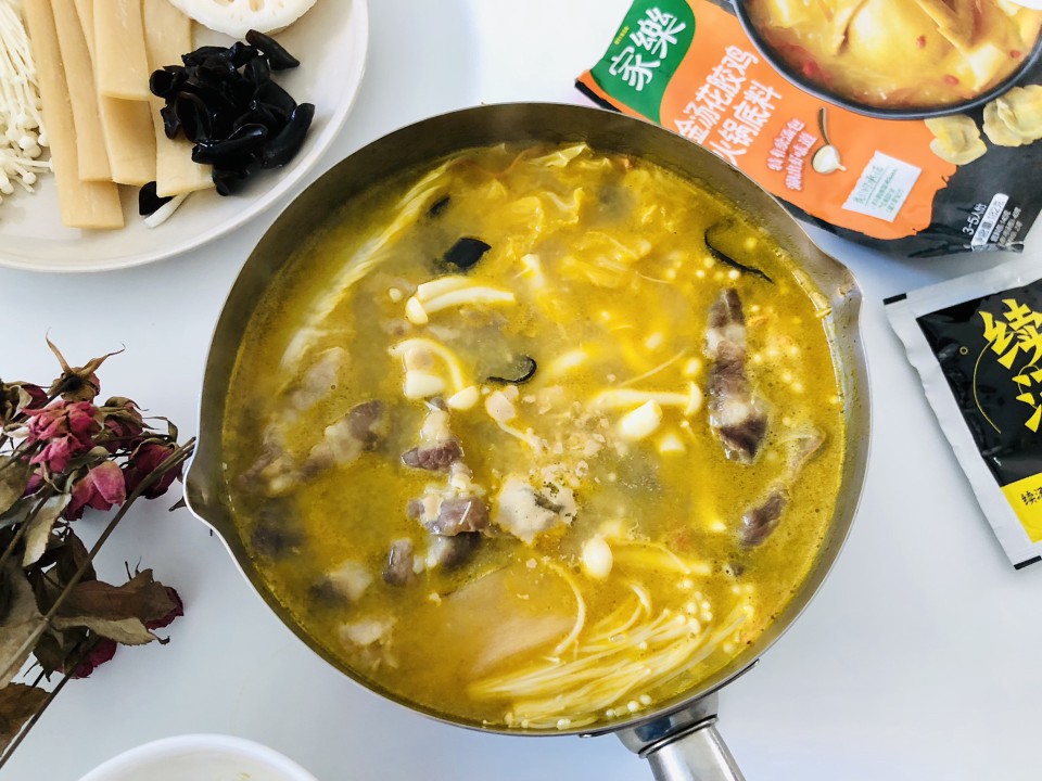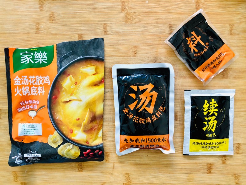 今天用到的是家乐金汤花胶鸡火锅底料,1500克的水烧开后,加入金堂花胶鸡底料包煮开后放入蔬菜、肥牛就可以了,浓浓的汤底味道非常不错,里面配了续汤包,真的太贴心了,完全不用担心味道变淡。