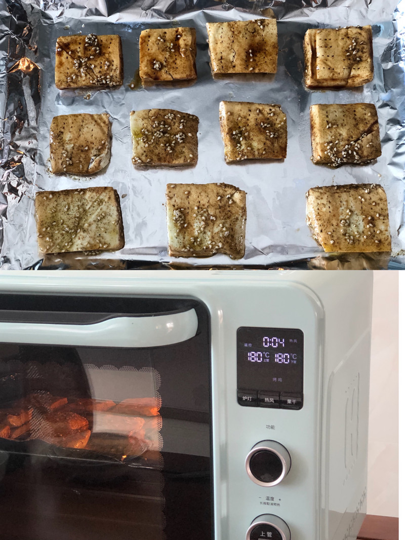 把豆腐放进酱料里,刷一刷,我用的是海氏C40烤箱,选择上下火180度,烤8分钟,取出,翻面,可以再刷点酱料,重新放回烤箱烤8分钟。烤好以后,取出撒上葱花即可。