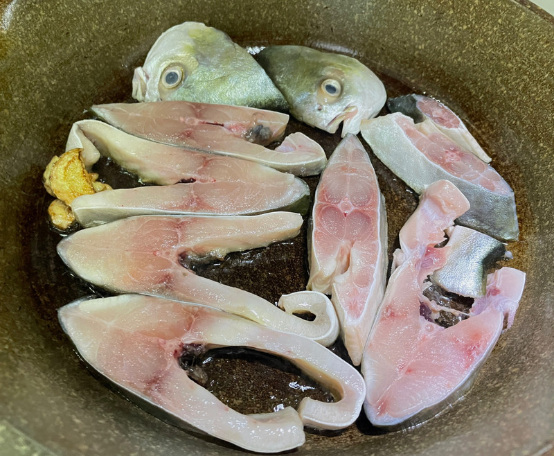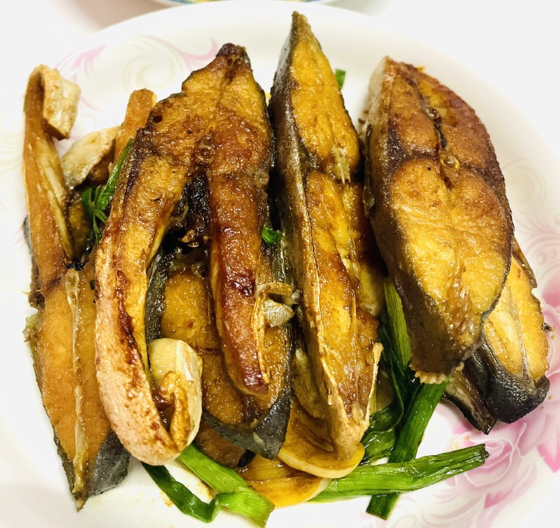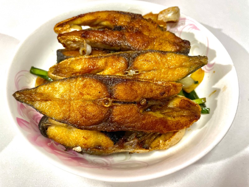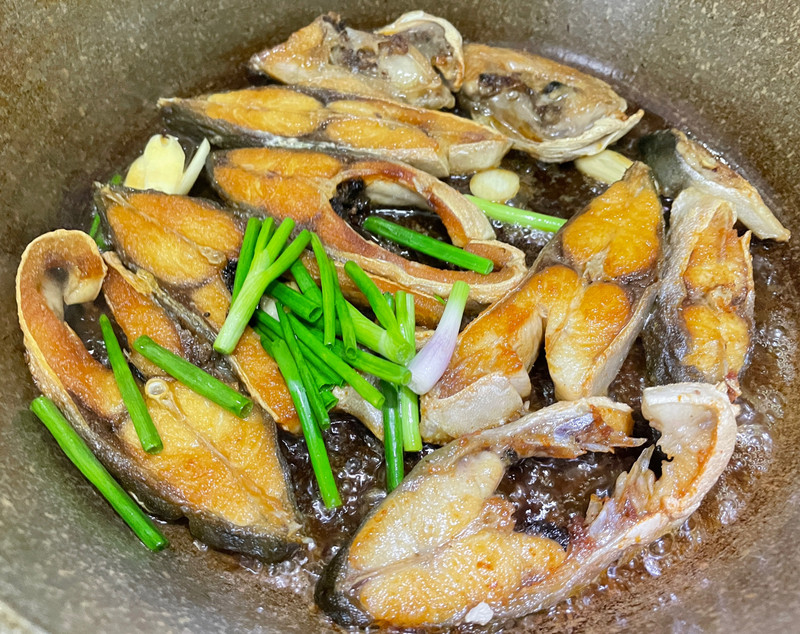 腌制的时候放了点盐,后续也烹入了酱油,所以煎鱼过程中不需要加盐了。