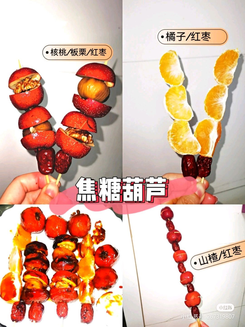 2、食材参考:葡萄、糯米、红豆、猕猴桃、 火龙果、小番茄、冬枣、山楂、板栗......糖葫芦一切你喜欢。