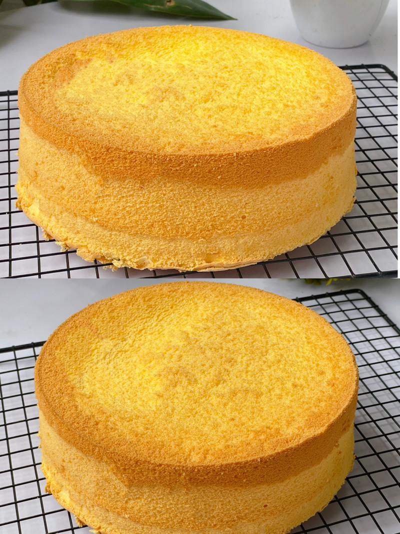 5⃣️出炉把蛋糕从15厘米处轻摔在桌面上,震去多余热气,即可倒扣晾凉脱模即可。