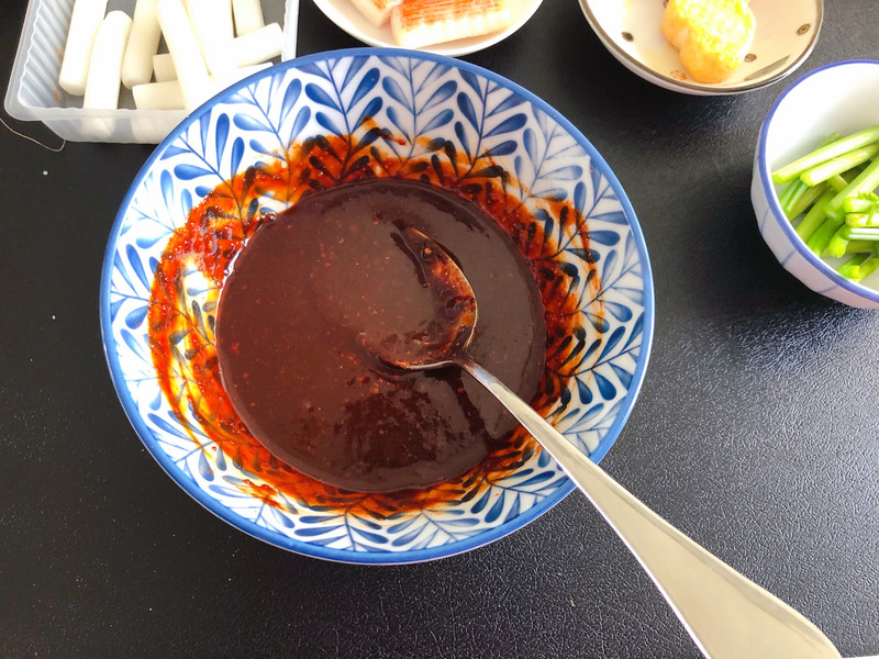 喜欢辣的可以适量多放点辣椒粉,在混合料汁的时候如果太稠可以适量加点水,辛拉面里的调味包不要扔掉,可以放入料汁里。