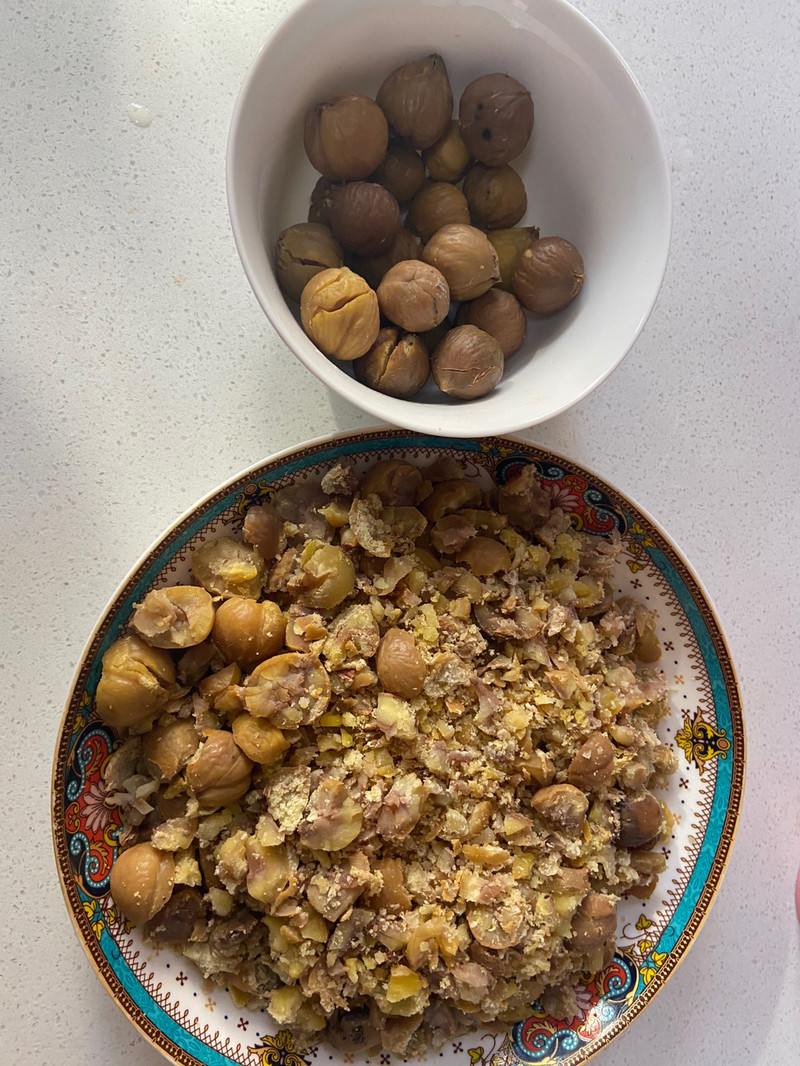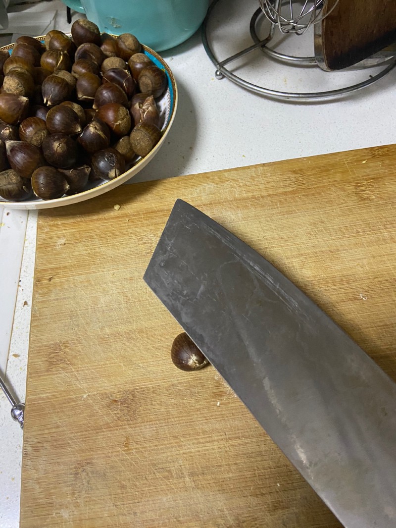 结果我买的是锥栗,好圆好滑,不好切口。太难了…然后为了吃栗子酱我几乎花了将近一天的时间,一半时间剥栗子,一半时间煮栗子酱,还有一部分时间处理了一下像是被炸了的厨房