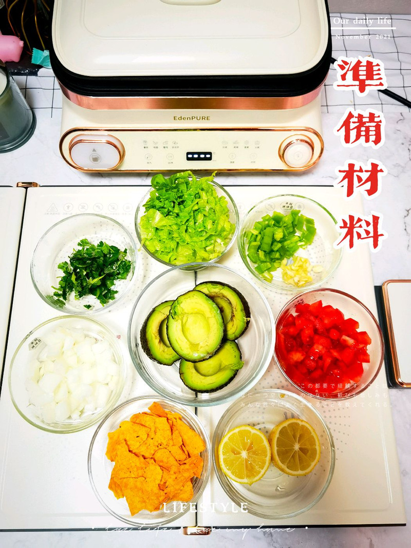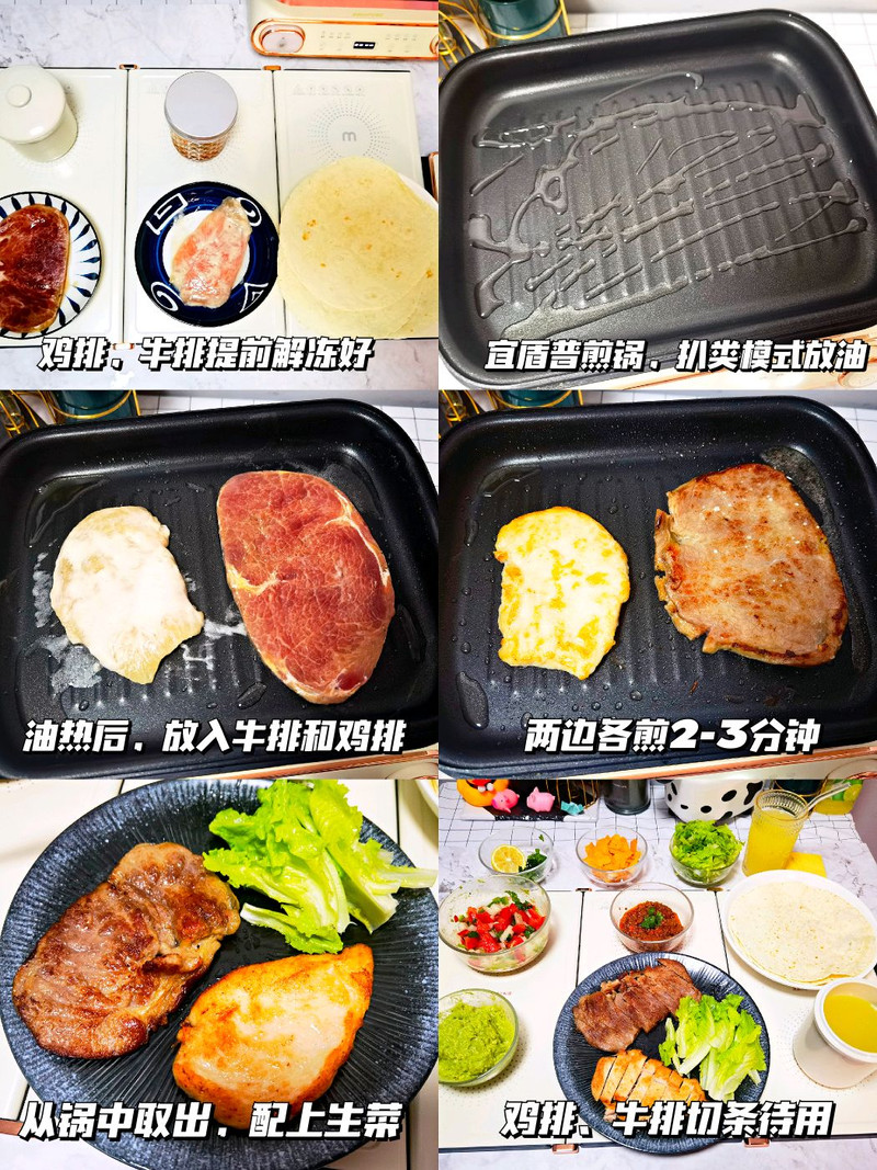 ✨Taco准备工作: 1.提前解冻鸡排、牛排,忘了解冻就赶紧放到摩飞暖菜板过微波炉解冻。 3.宜盾普魔方蒸汽炸多功能料理锅 ,放上煎烤盘,选择扒类功能。自主炸功能也不错,它家的是蒸汽炸,比我之前的空气油炸锅好多了,可以锁住肉汁,不会干。倒油,同时放入牛排和鸡排煎至喜欢的熟度,锅大就是爽。煎的差不多了,切成小条,乘出备用。 4.在煎烤盘中加入以前做好的意大利肉酱(之前自己做的,满满都是牛肉,没有的买个意大利面酱代替也),炒出香味即可乘出。照做不好吃你找我的烹饪技巧