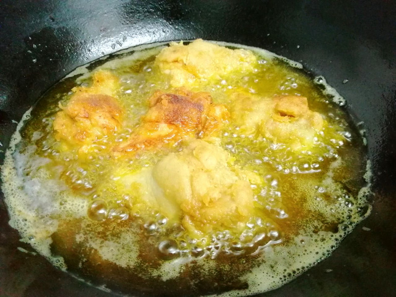 小火慢炸,这样里面的鸡肉才能炸熟炸透,外边裹的面粉壳才会酥