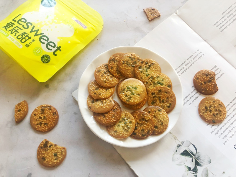 香葱芝麻薄脆,一款简单又快手的小吃,并且不用打发,香葱的香味加上芝麻的清香,一口一个嘎嘣脆,特别是加了爱乐甜零卡糖,好吃不上火哦。