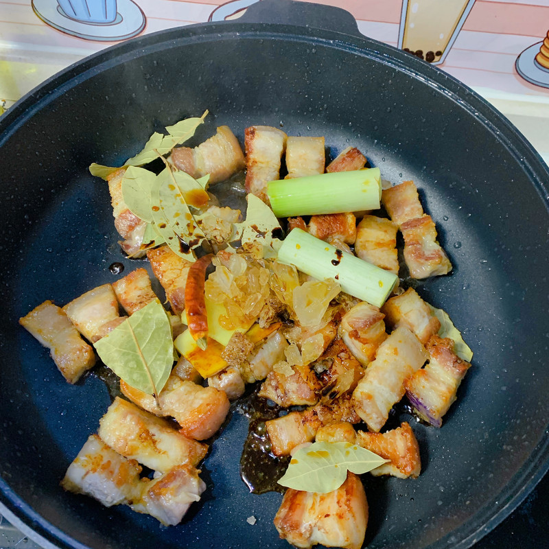 锅中倒一点点油 放入五花肉煎制 中小火煎制 注意翻面 把所有面都煎至金黄色 这个过程不要急哦 慢慢煎 注意安全 小心会烫到 煎肉会出很多猪油 要倒掉哦 加入葱段 姜片 香叶生抽 老抽 冰糖 选加干辣椒 花椒 炒香 炒上色
