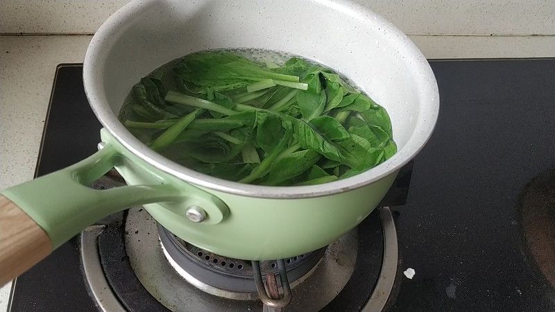 主要看状态,不用太久,熟了就行,绿叶菜一般菜叶变软,颜色变深,锅里的水变绿,就差不多了。