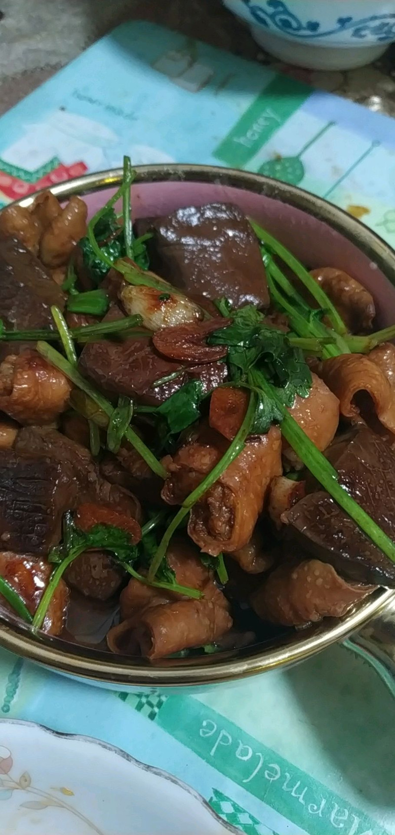 因为家里娃娃不吃辣所以没有放辣椒 建议吃辣的放干辣椒和小米椒或者泡椒 味道更好!另外买了两斤肥肠一次性卤的 炒一盘只用了150克左右 所以材料里面只写了150克大肠