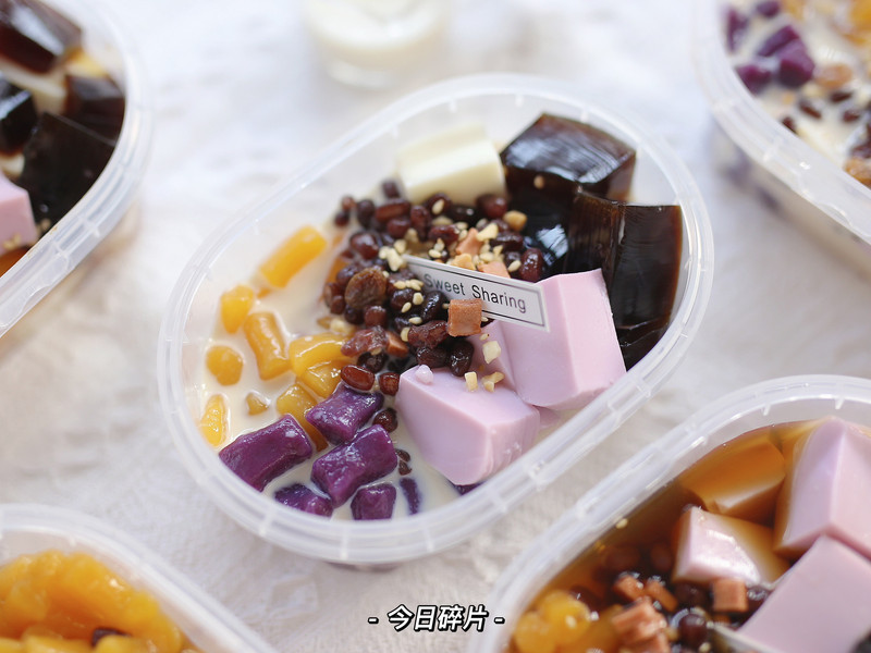 最后就是组装部分了,把椰奶冻、紫薯椰奶冻、咖啡冻切块,倒入小盒内,再加入煮好的芋圆,根据个人喜好,放上蜜豆、熟白芝麻、山楂碎