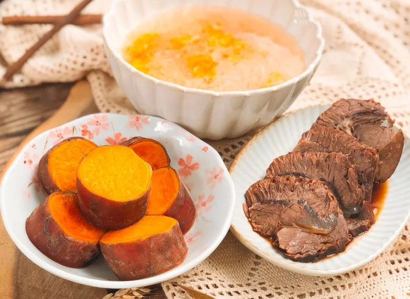 卤牛肉蒸红薯木瓜银耳糖水
