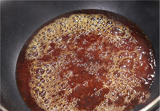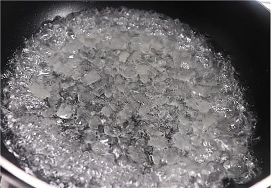 冰糖入锅后,我们应该用铲子沿着一个方向不断搅拌。熬糖色时,温度不宜过高。中火熬制。持续搅拌可使冰糖在锅中加热均匀。大约两分钟后,冰糖完全融化了。冰糖熬制融化后,会发现锅里会有很多密集的气泡,然后我们必须继续搅拌,不能停止熬制方法的烹饪技巧