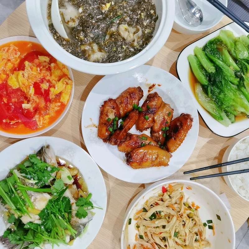 家常菜 清蒸鲈鱼 蜜汁鸡翅 番茄炒蛋 蒜蓉生菜 紫菜蛋花汤
