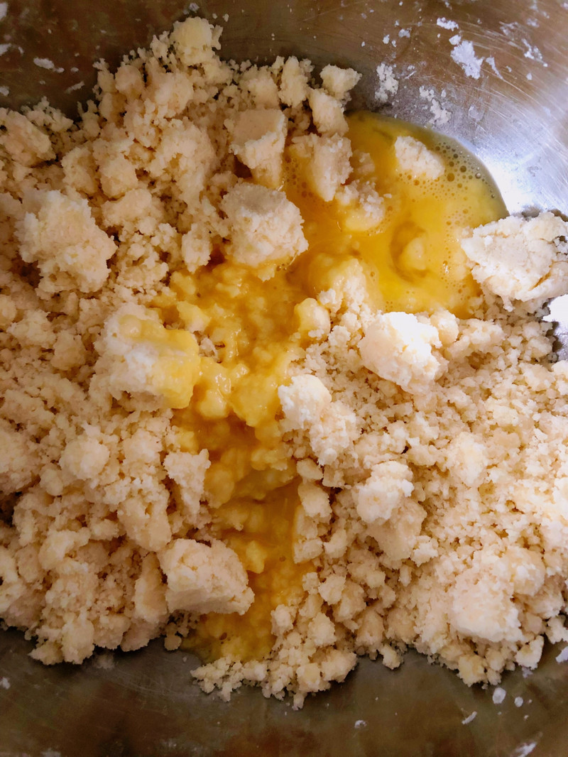 1. 面粉+泡打粉+白糖+花生油混合搓成粒