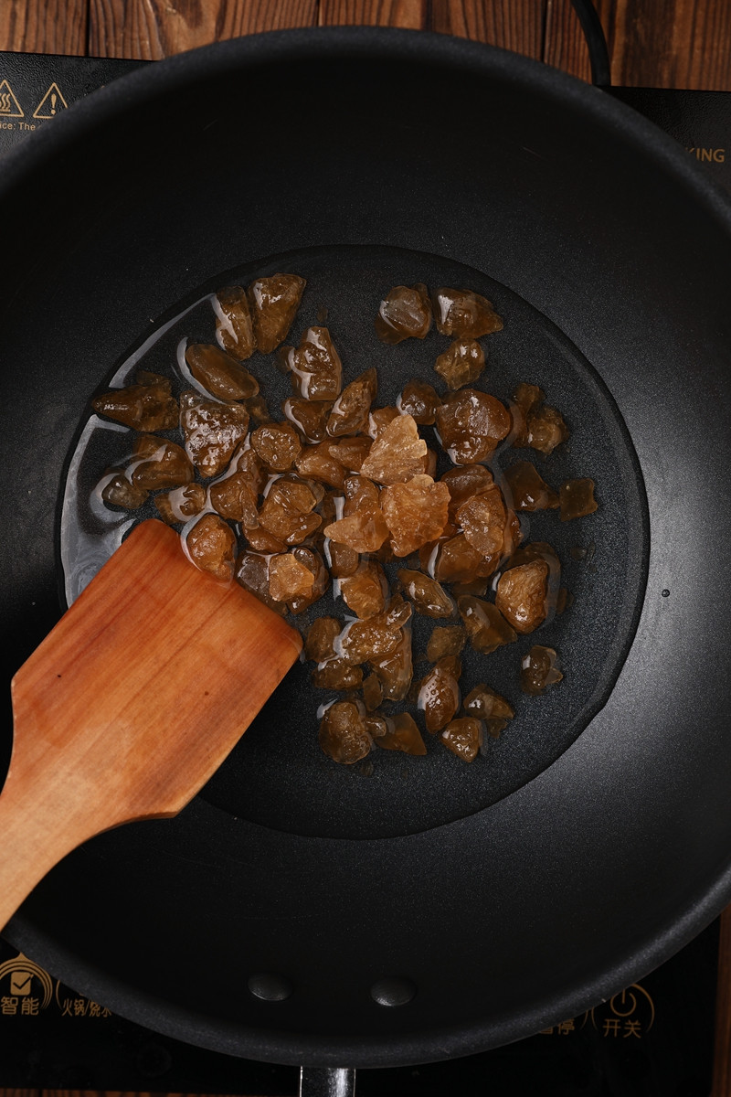 冰糖放入锅中后,要用铲子朝一个方向不停搅拌。熬糖时,温度不能太高。中火熬。不断搅拌可以使冰糖在锅内受热均匀。大约两分钟后,冰糖完全融化。冰糖煮熬融化后,我们会发现锅里会有很多密密麻麻的气泡,然后一定要不停的搅拌,不能停。糖色的烹饪技巧