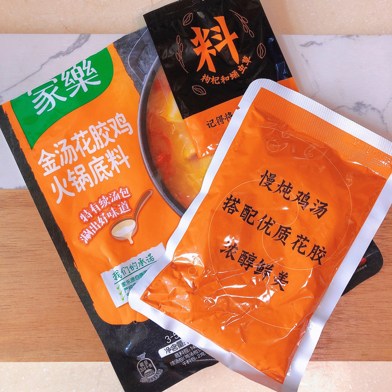 准备好优质火锅底料-家乐金汤花胶鸡火锅底料,准备河粉、蔬菜,不用十分钟一锅汤色金黄,浓醇味鲜的花胶鸡汤河粉就出锅了。不管是喝汤还是吃粉,都是一番美味,让汤吃河粉提升一个度。