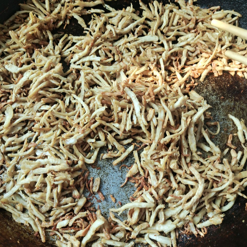 撕鸡丝时不是特别好撕,可以先从中间撕开,再逐步从每块的中间撕。喜欢吃辣的可以放点辣椒粉。腌制时间10分钟左右即可,我一般都是腌制时候该干嘛干嘛,有时间了再去炒