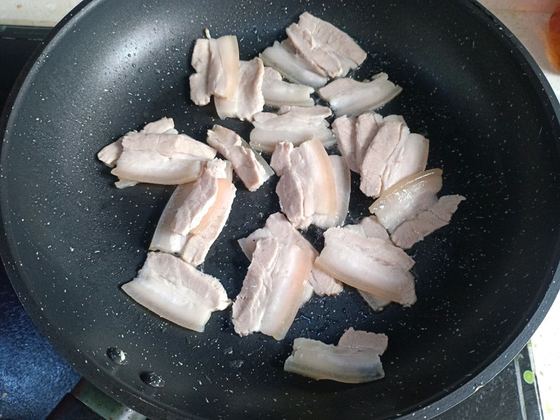 热锅不放油,煸炒至肉片出油,呈打卷状再下次葱姜蒜炒香。